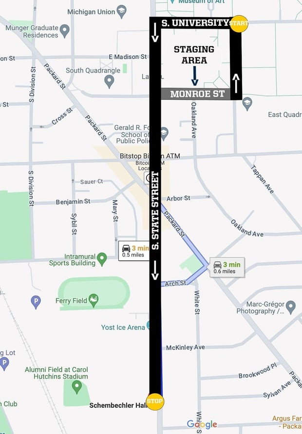 प्रशंसकों को राष्ट्रपति भवन के बाहर साउथ यूनिवर्सिटी ड्राइव पर, पश्चिम में छात्र संघ तक, और दक्षिण में स्टेट स्ट्रीट से योस्ट आइस एरेना तक लाइन में लगने के लिए प्रोत्साहित किया जाता है। ऐन आर्बर शहर सुबह 8 बजे परेड मार्ग की सड़कें बंद कर देगा